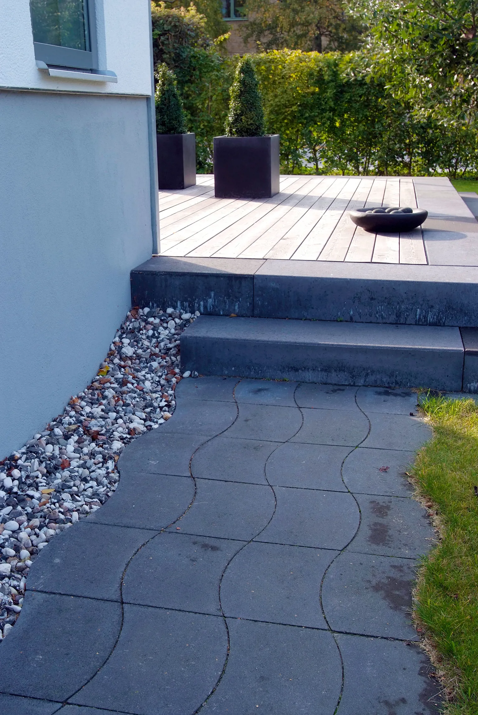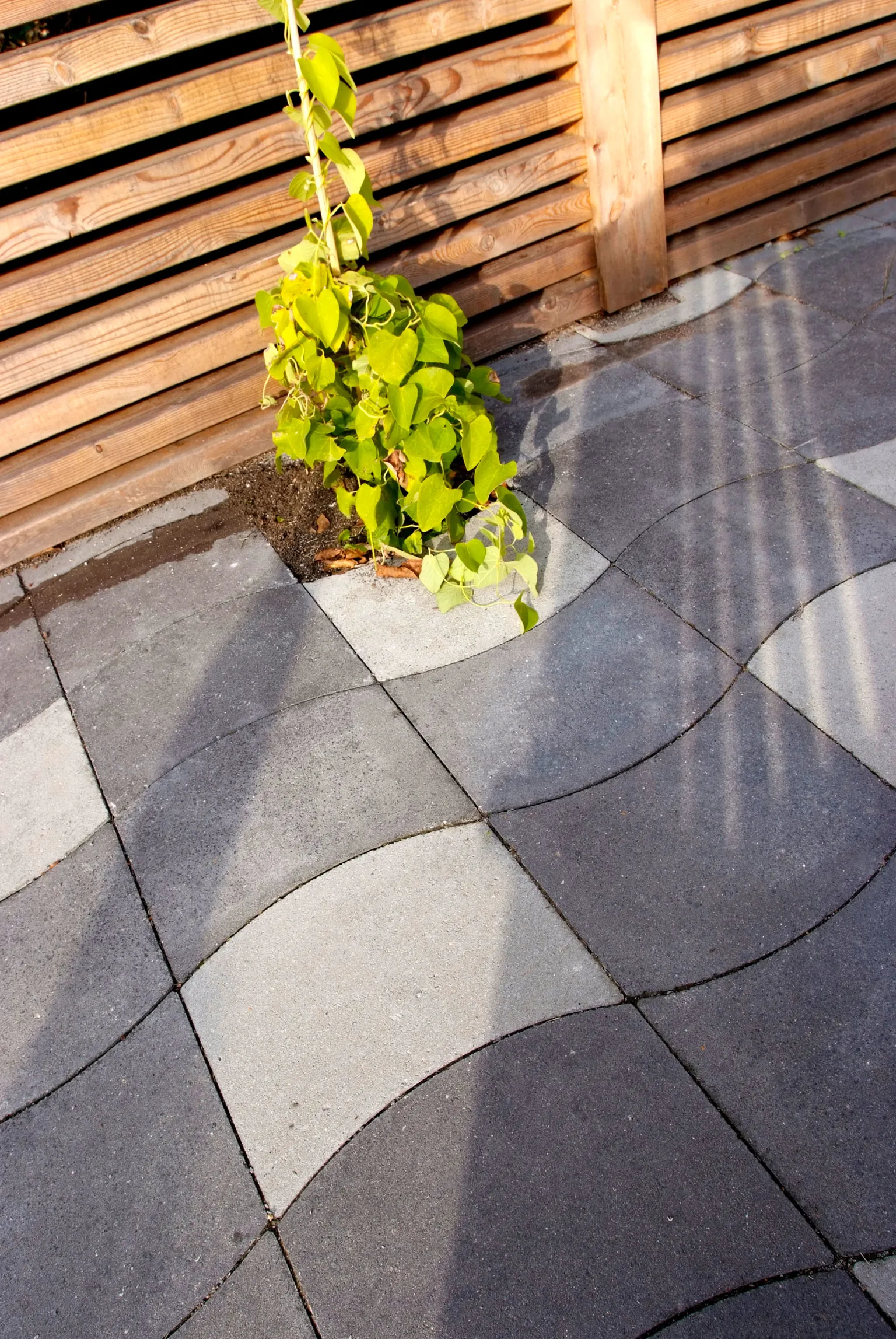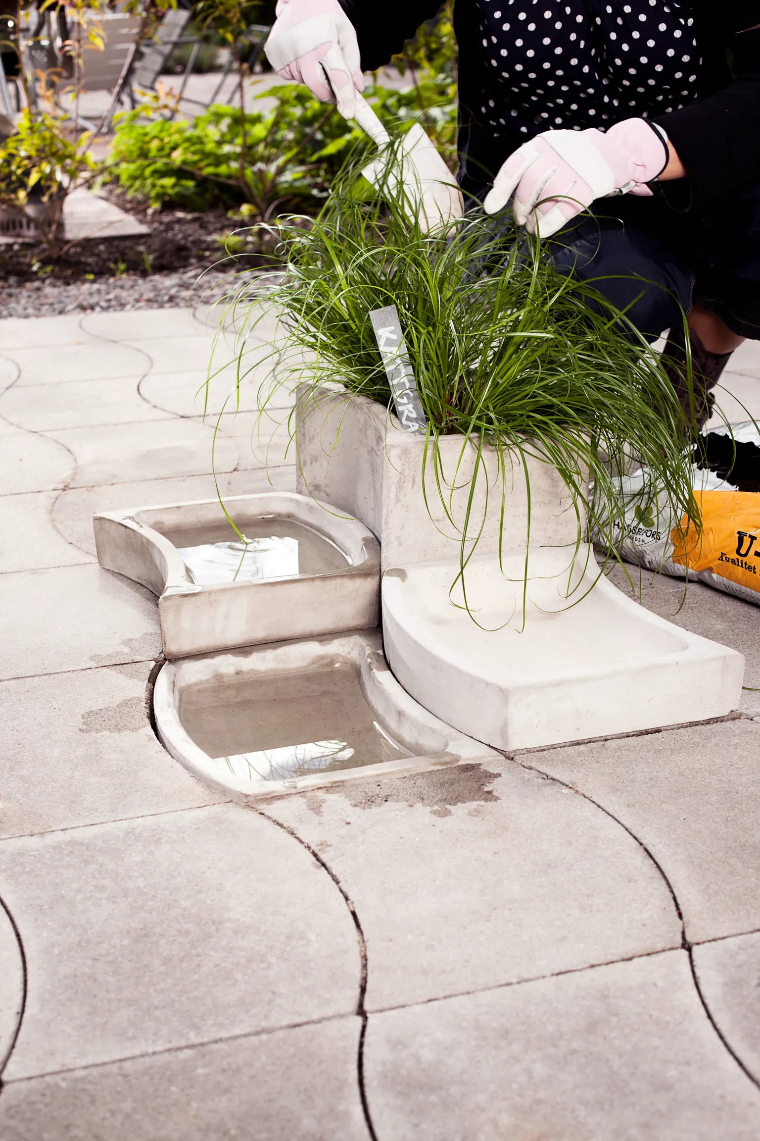 Alla delar i konceptet går naturligtvis att kombinera då de har samma konturmått. De tre elementen smyger sig in i växtligheten och lockar till det individuella skapandet. Plattan kan även användas som kantsten.