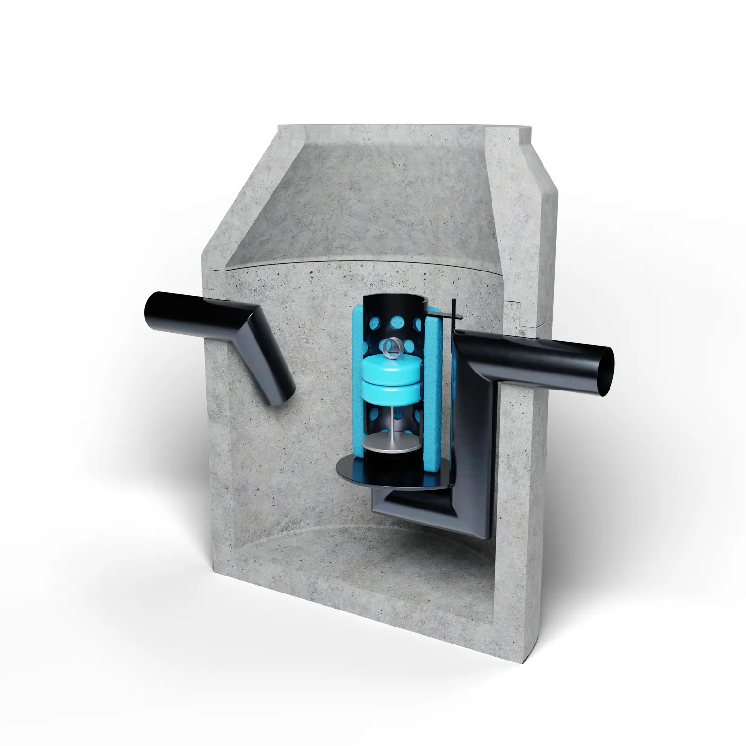 Avskiljaren består av robusta betongdelar i kombination med ett in- och utloppssystem i PE-plast. Koalescensfiltret placeras vid utloppet och ökar avskiljningseffektiviteten. För att säkerställa funktion även vid oljespill är ett mekaniskt flytlock integrerat – det stänger automatiskt utloppet vid för hög oljenivå.