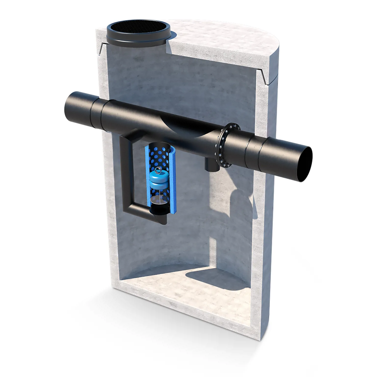 Tack vare bypass-funktionen leds överflödigt vatten förbi reningsdelen utan att slam eller olja spolas ut. Avskiljaren uppfyller kraven enligt SS-EN 858-1 för klass I och följer AMA Anläggning 23, kod PDF.2.