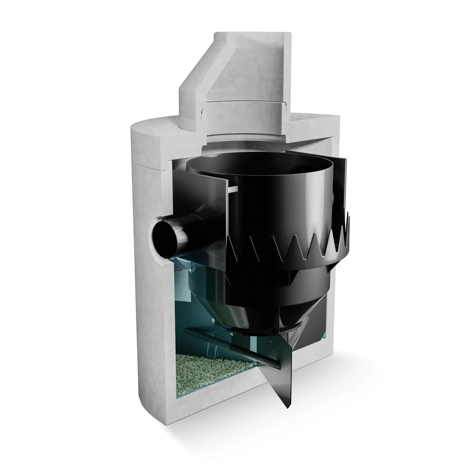 Tack vare den smarta konstruktionen ryms hela reningssystemet i en enda betongbrunn, vilket förenklar installationen och minimerar behovet av utrymme. Avskiljaren är konstruerad utan nivåskillnad mellan in- och utlopp, vilket gör att den inte påverkar ledningsfallet – en viktig fördel vid dimensionering och projektering.